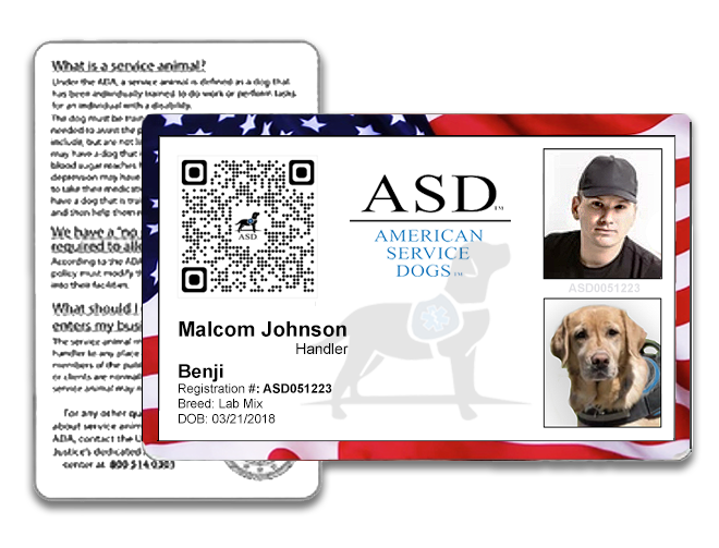 The ASD™ Registry ID Card+, Detachable Certification Tag and Vest or Harness combined, provide a "Triple Tandom Validation", which stops fraudulent use from occurring. All three items have the ASD™ Registry certification number assigned for the "Service Dog" and their "Handler. If the numbers don't match, fraudulent use is evident and verified.